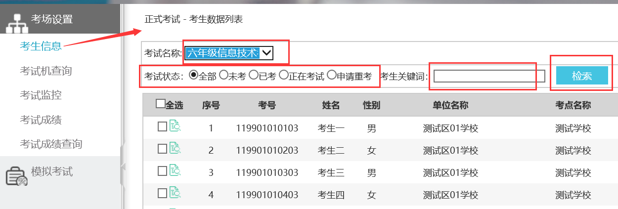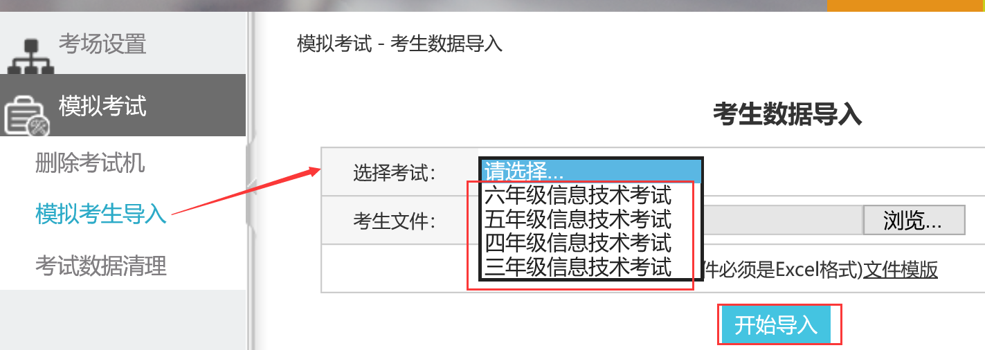 3、 导入数据。如下图所示,选定需要导入考生的考试,然后点“浏览”按钮,在弹出的文件选择框中选择整理好的Excel文件,最后点“开始导入”,导入成功后,在“考场设置”>>“考生信息”菜单处,可以查看学生信息。考试名称下拉菜单框选定考试名称,点选需要检索的考试状态,点击“检索”按钮就可以查看到相应的考生信息了。