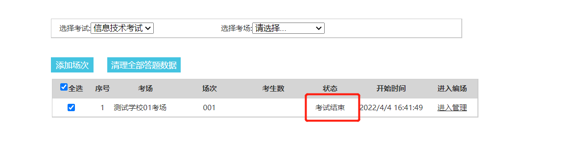 “考试结束”),可以直接清理答题数据,学生原机二次登录考试。如果点了“结束”按钮,该场次的状态变成了“考试结束”,则只能使用“清理答题及编场数据”按钮,清理成功后,老师需要重新添加场次,编场,开考……。